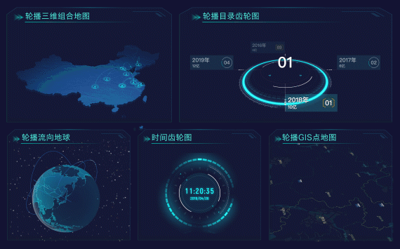 - 我們基于webgl等技術(shù)開發(fā)了大屏圖表插件,通過簡單拖拽即可實現(xiàn)自動播放、3D動畫特效等多種效果;圖表類型包括輪播三維組合地圖、輪播gis點地圖、流向地球、時間齒輪和目錄齒輪等,科技感十足,讓大屏展示效果更加炫酷